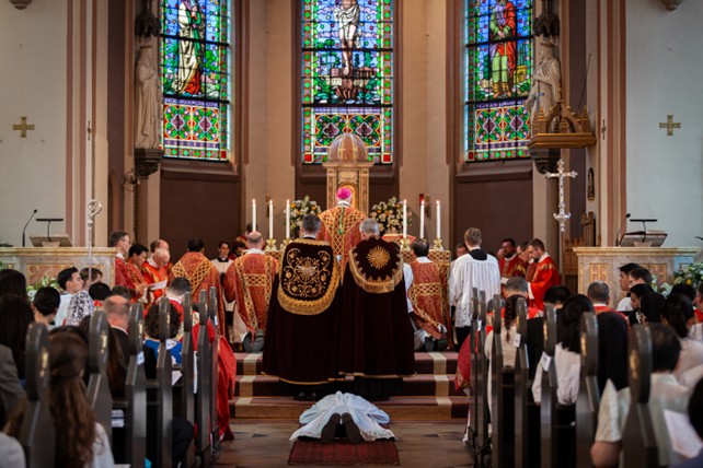 Mathias Bruno Ledum ligt uitgestrekt op de grond tijdens de Litanie der Heiligen bij zijn wijding tot diaken in de H.Olav kathedraal in Oslo.(Foto: EWTN News)