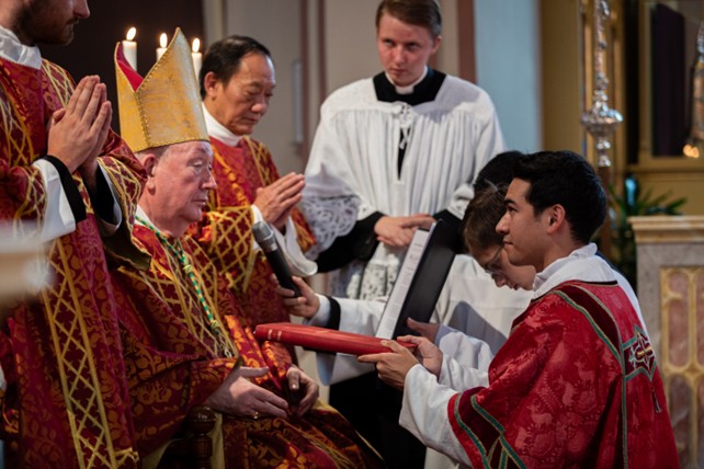 Mathias Bruno Ledum ontvangt het evangelie van bisschop Bernt Eidsvig tijdens zijn eerste mis als diaken.(Foto: EWTN News)